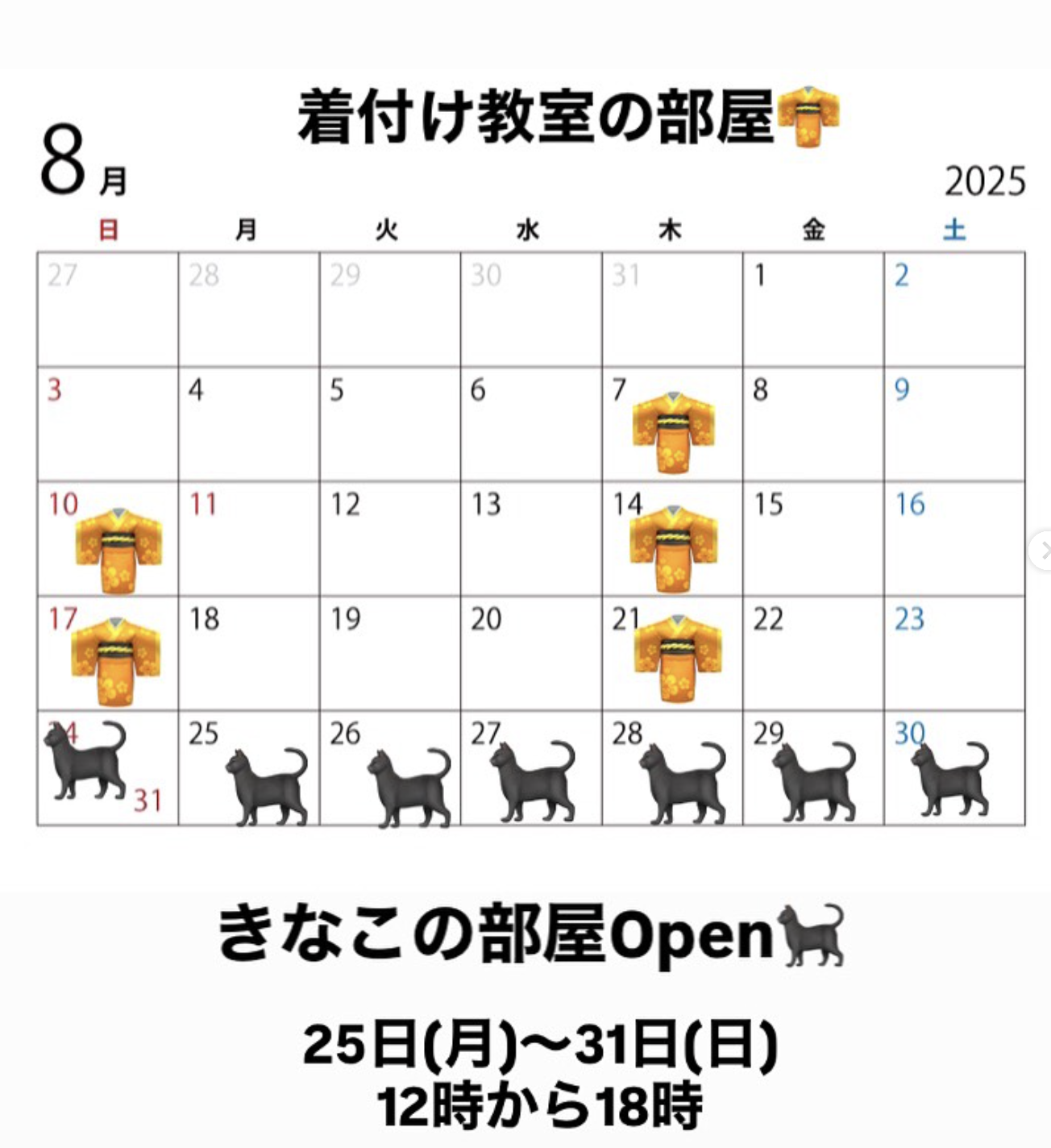 きなこの部屋8月オープン アンティーク着物 2025.08.11 8月のきなこの部屋の予定です😸 ものすごい暑さなので🌞お家でお買い物できるよう、きなこハウス通販の方にも商品をいろいろアップしていきたいと思います。着付け教室の部屋については📌ピン留め投稿を参照の上、DMでお問合せくださいね。