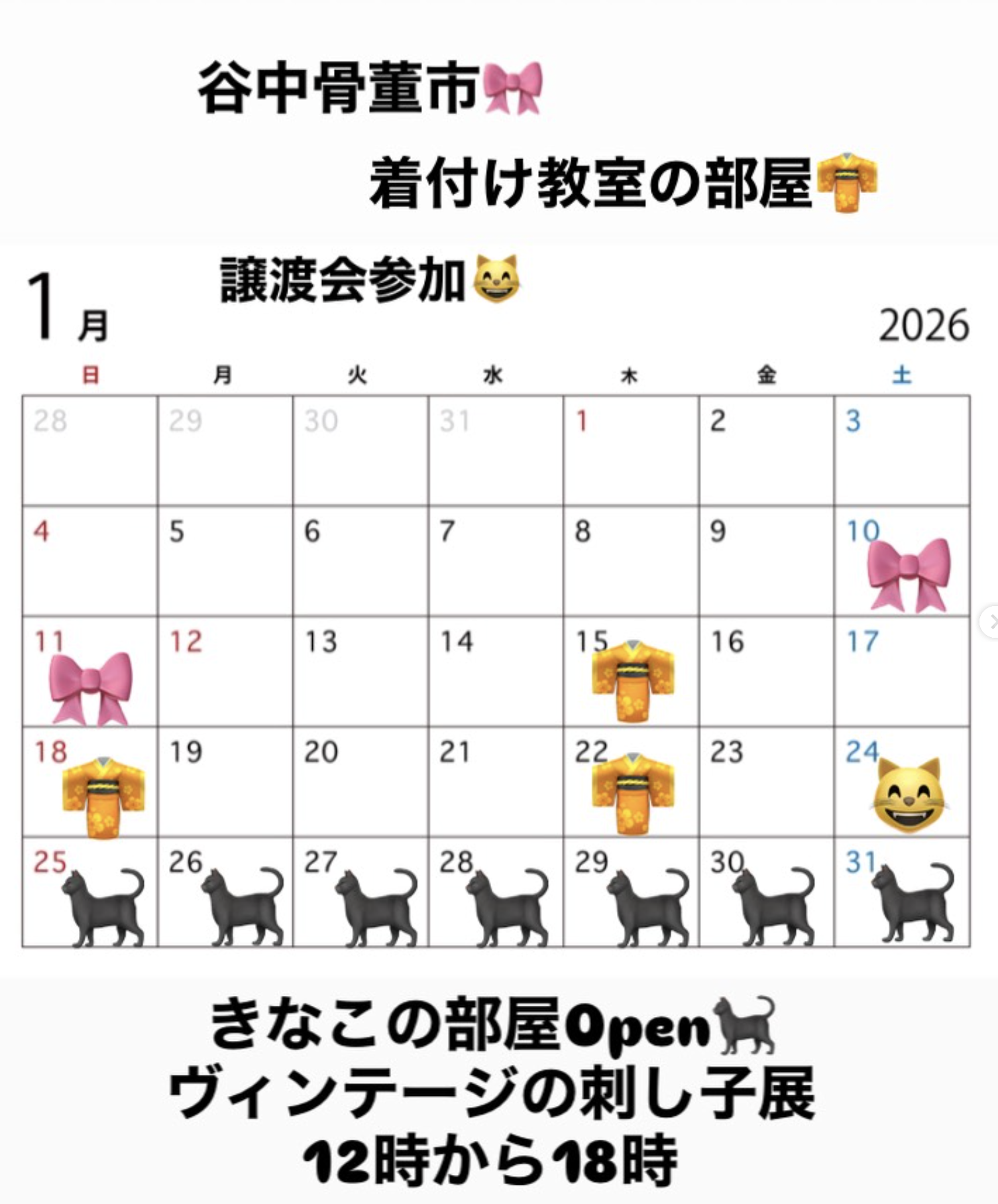 #1月の予定#早いですね #谷中骨董市 #保護猫譲渡会 #ヴィンテージの刺し子展